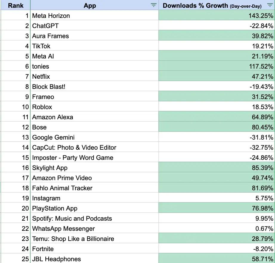 (Source: Sensor Tower: 12/25 — U.S. — App Store/Play combined: Games + Apps. Green = Up At Least 20% DoD)