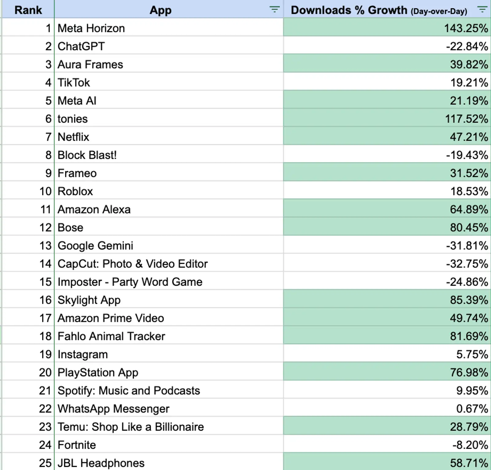 (Source: Sensor Tower: 12/25 — U.S. — App Store/Play combined: Games + Apps. Green = Up At Least 20% DoD)
